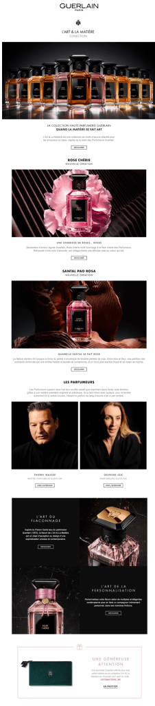Fondée il y a plus de 180 ans, la Maison Guerlain au travers de cinq générations de parfumeurs, a ponctué l’histoire de la parfumerie d’oeuvres olfactives majeures. A la fois enracinée dans ses origines artisanales et visionnaires, la Maison continue de cultiver sa différence, et de transmettre son savoir-faire unique et sa passion dans ses créations empreintes d’audace.