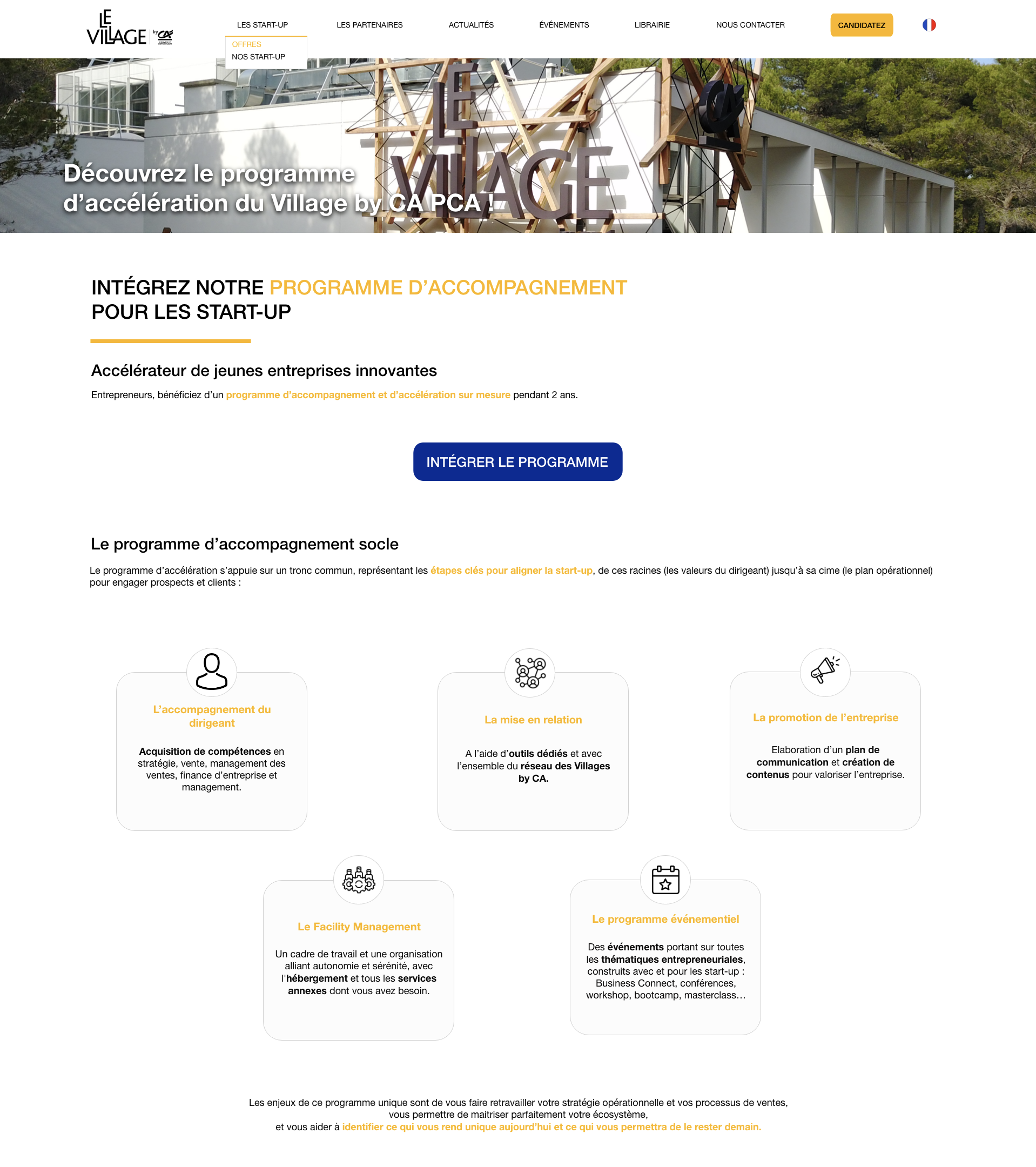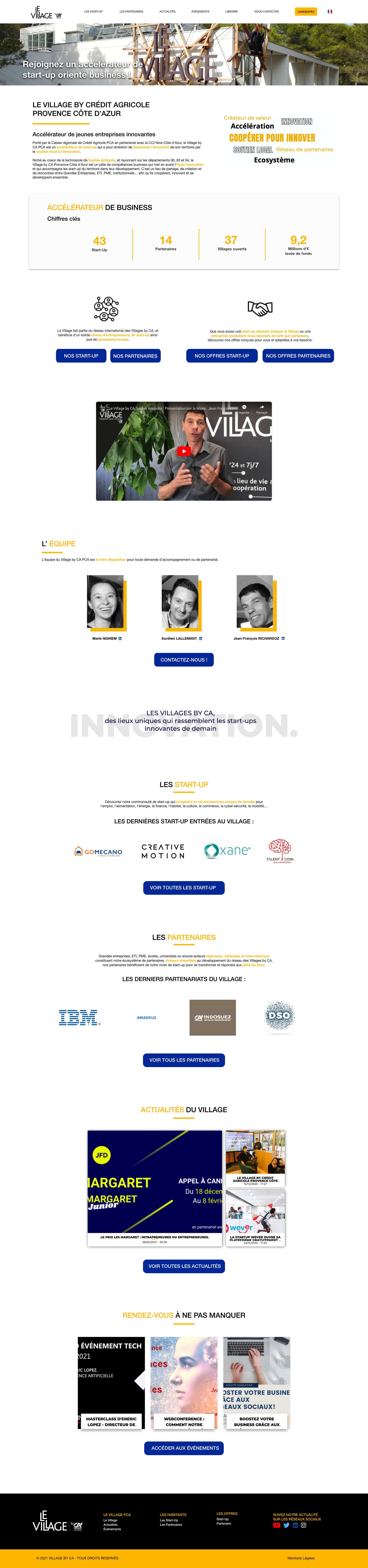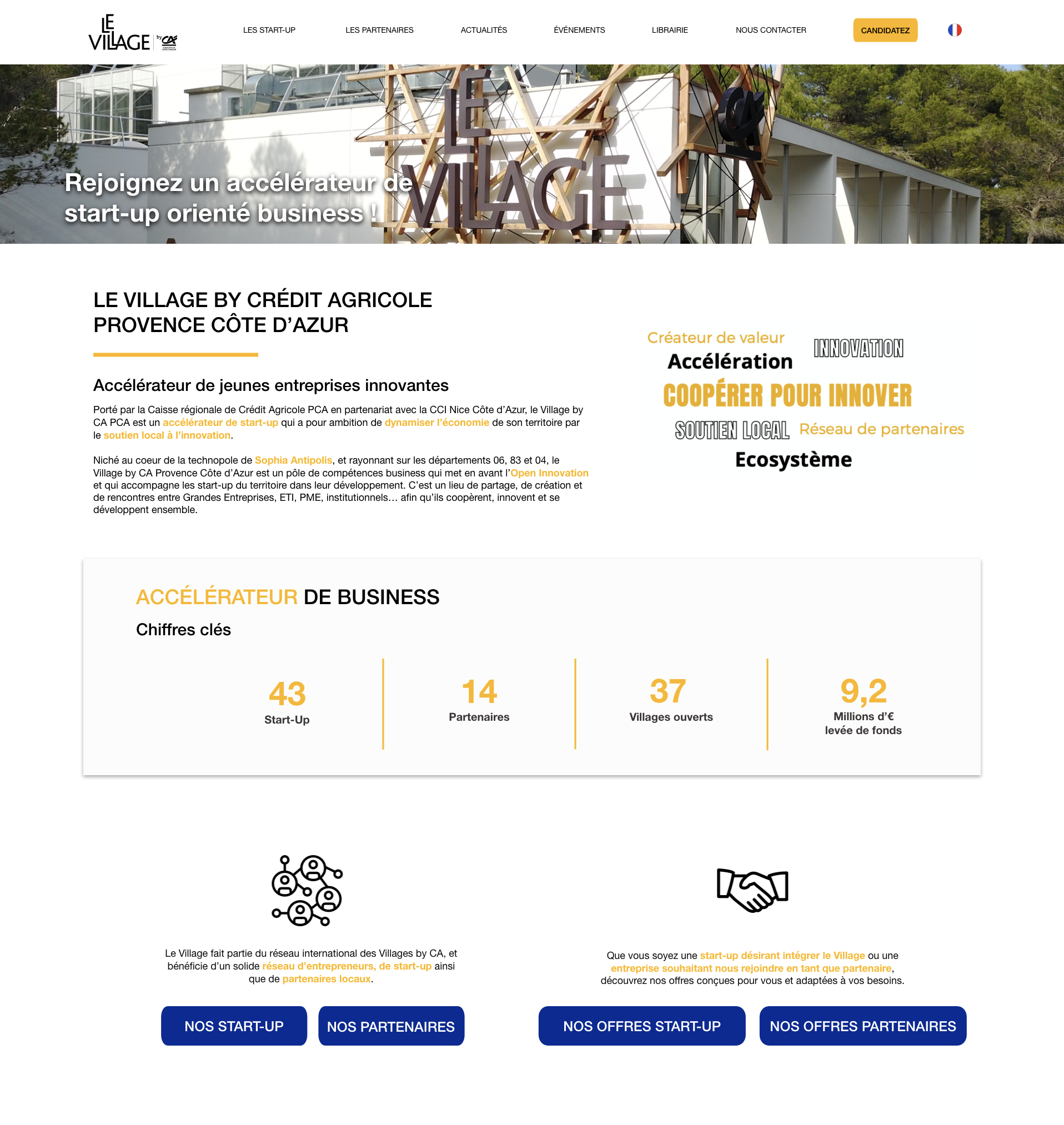 Porté par la caisse régionale du Crédit Agricole Provence Côte d’Azur, le Village by CA est un accélérateur et hébergeur de start-up implanté au cœur de la technopole de Sophia Antipolis. Le Village est un lieu de partage, de création et de rencontres, qui permet la coopération, le partage des savoirs et des connaissances, et favorise un développement commun. L’objectif du Village by CA Sophia est d’accompagner des start-up innovantes dans leur développement en leur proposant un programme d’accélération, créateur de valeur pour l’entreprise et son dirigeant.